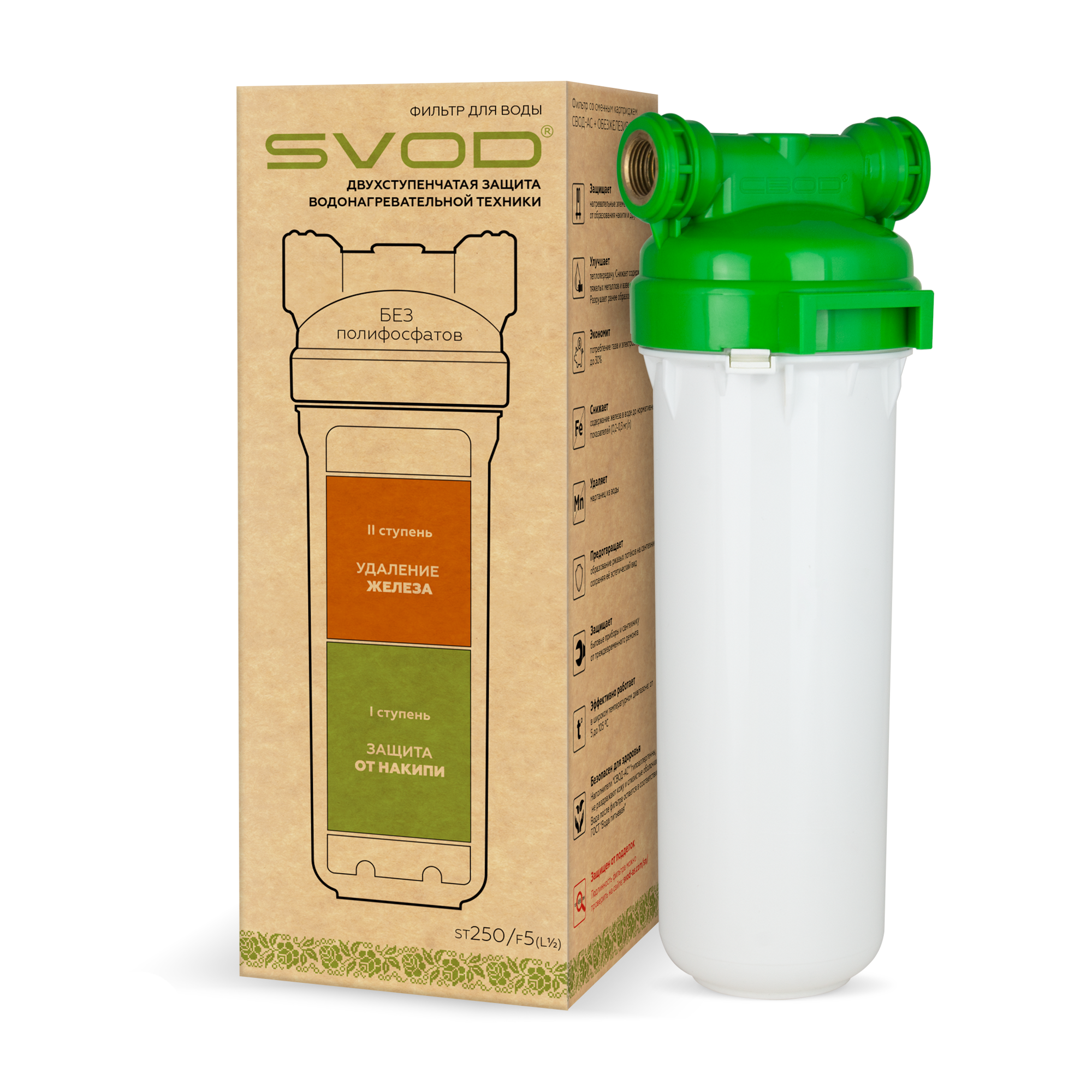 Фільтр призначений для захисту поверхні теплообміну від накипу і корозії (в тому числі і видалення раніше утворенної), а також для зниження вмісту заліза у воді і видалення марганцю та алюмінію (підключення — латунна різьба). Картридж фільтра складається з двох модулів, що забезпечує двоступеневий захист теплотехніки: Перша ступінь — протинакипний модуль «СВОД-АС»: забезпечує захист нагрівальних елементів всіх типів від накипу та інших відкладень. Руйнує раніше утворену накип. В результаті застосування фільтра з картриджем ST250/F5 накип не утворюється, поверхня теплообміну не заростає іржею, збільшується термін експлуатації водогрійного обладнання та сантехніки, а також заощаджується споживання газу і електроенергії. Другий ступінь — модуль знезалізнення: забезпечує зниження вмісту заліза у воді. Витягує з води нерозчинне (тривалентне) залізо, крім того переводить розчинне (двовалентне) в нерозчинну форму і відфільтровує його. Тим самим, відбувається зниження вмісту заліза у воді до нормативних показань (0,2 — 0,3 мг / л), а так само видаляється марганець та алюміній. Технічні характеристики: Розмір — 10 дюймів Ресурс фільтру — до 42 000 літрів * Підключення — 1/2 «(латунна різьба) Температура оброблюваної води: від 5 до 40 ° С Робоча температура води, що нагрівається: від 5 до 105 С? Максимальний тиск води — до 0,6 МПа (6 атм.) Продуктивність фільтру — 1 — 2 м3 / рік Термін експлуатації (картриджа) — 1 рік Термін придатності (картриджа) — 3 роки * За умови відповідності води ДСТу «Вода питна» * При підвищених значеннях заліза (Fe) і жорсткості ресурс визначається за графіками на рис. 2 і 3. Комплектація виробу: Корпус фільтра Кришка фільтра Картридж «СВОД» S250/F5 Ключ Кронштейн Паспорт і інструкція експлуатації Календар заміни
